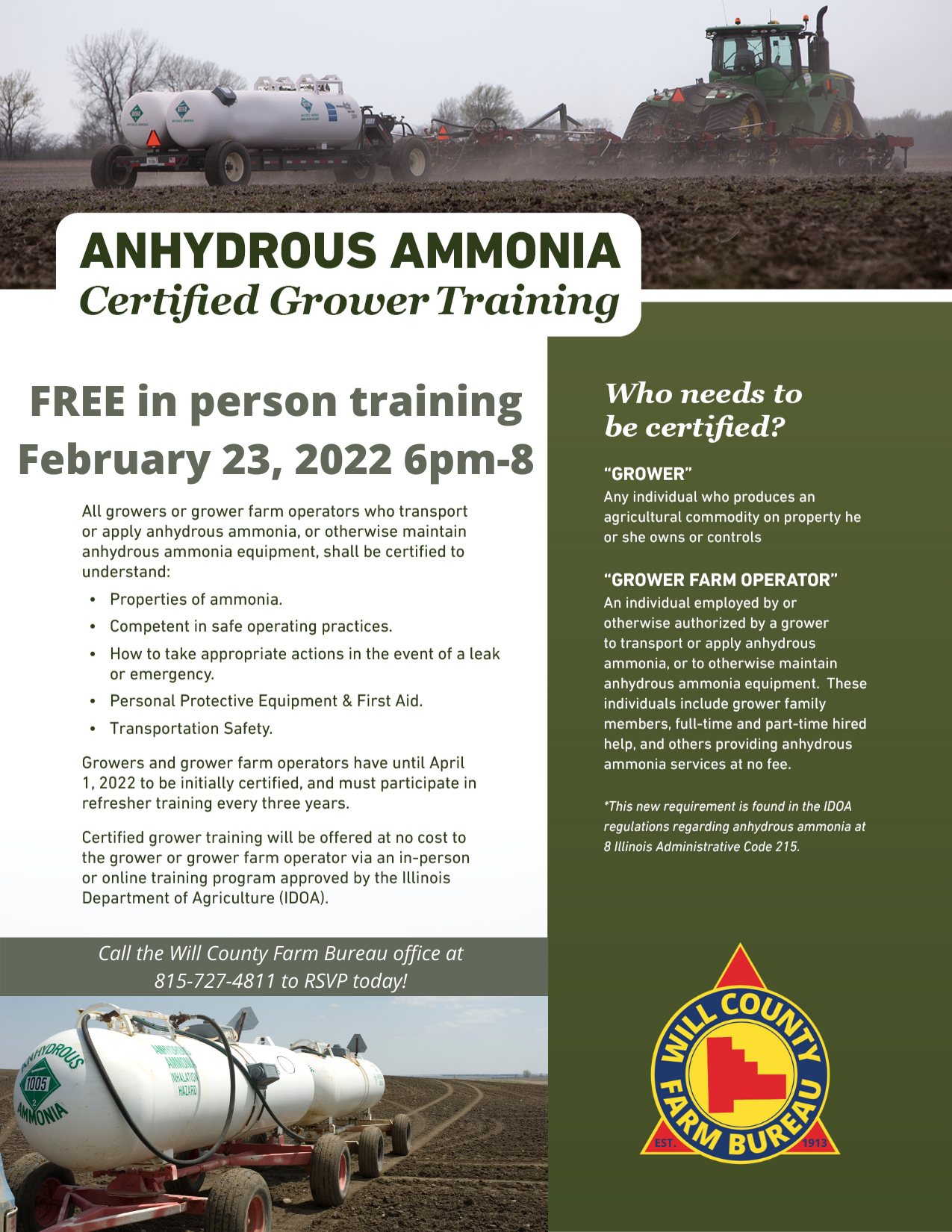 Anhydrous Training at WCFB Wednesday, February 23, 2022 6:00 PM 8:00 PM Will County Farm Bureau 100 Manhattan Road Joliet, IL, 60433 United States (map) Google Calendar ICS