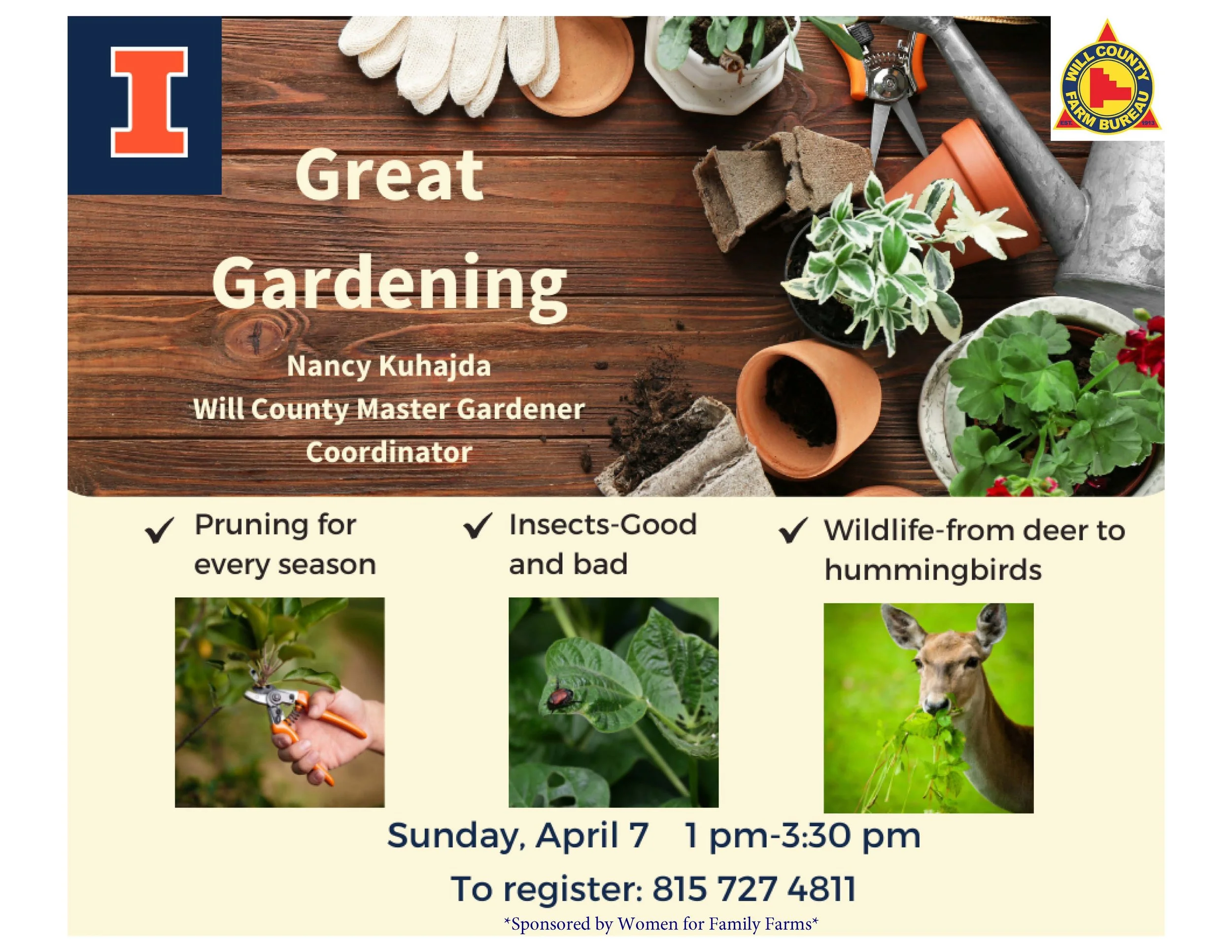 'Great Gardening' with Nancy Kuhajda sponsored by WFFF - MUST REGISTER 815-727-4811 Sunday, April 7, 2024 1:00 PM 3:00 PM Will County Farm Bureau 100 Manhattan Road Joliet, IL, 60433 United States (map) Google Calendar ICS
