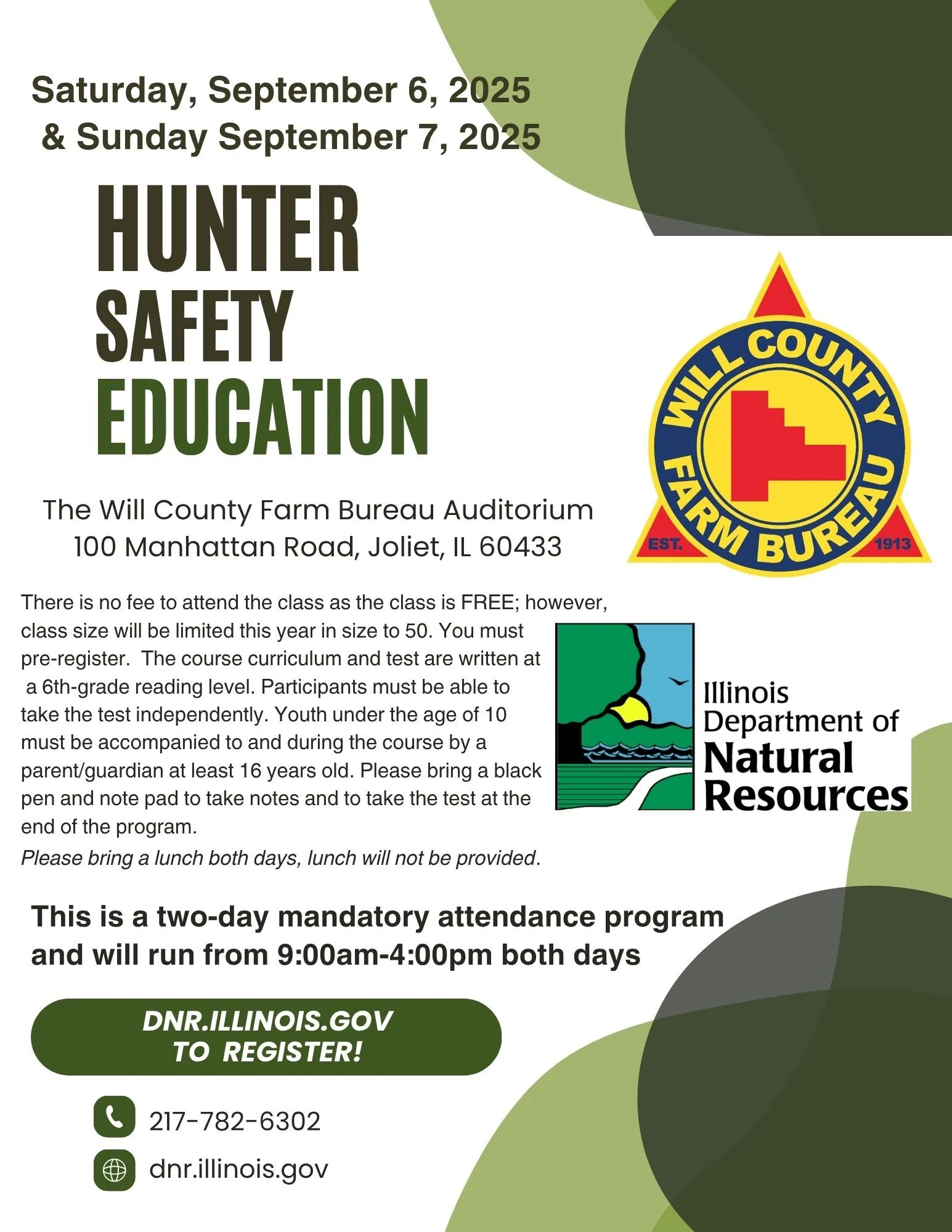 Hunter Safety Education Day 1 Saturday, September 6, 2025 9:00 AM 4:00 PM Will County Farm Bureau 100 Manhattan Road Joliet, IL, 60433 United States (map) Google Calendar ICS