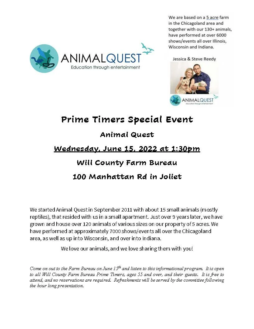 Prime Timer Special Event 'Animal Quest' Wednesday, June 15, 2022 1:30 PM 3:30 PM Will County Farm Bureau 100 Manhattan Road Joliet, IL, 60433 United States (map) Google Calendar ICS