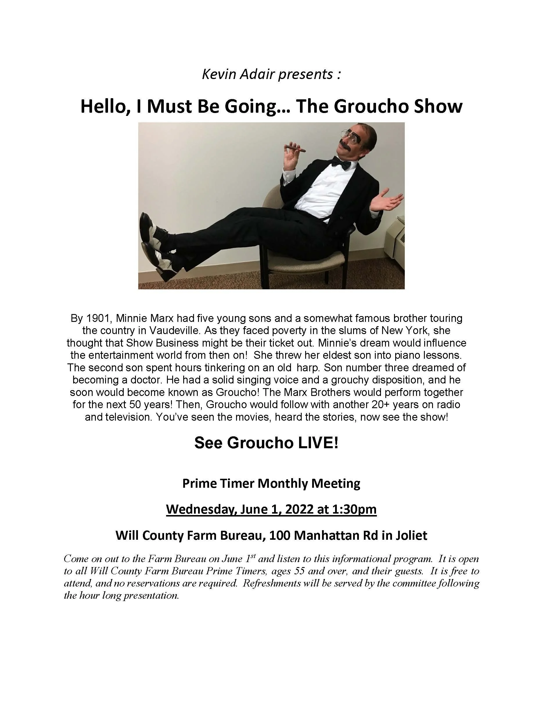Prime Timers Meeting Wednesday, June 1, 2022 1:30 PM 3:00 PM Will County Farm Bureau 100 Manhattan Road Joliet, IL, 60433 United States (map) Google Calendar ICS