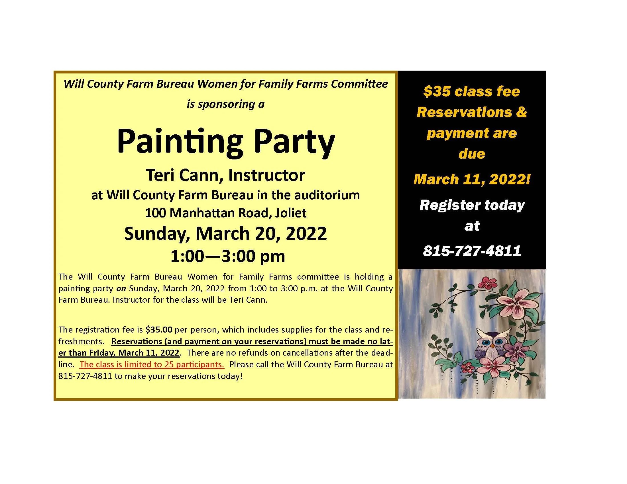 Back to All Events WFFF Painting Party Sunday, March 20, 2022 1:00 PM 3:00 PM Will County Farm Bureau 100 Manhattan Road Joliet, IL, 60433 United States (map) Google Calendar ICS